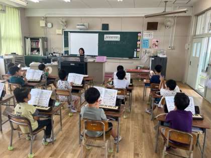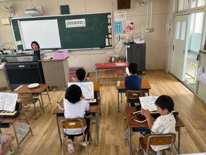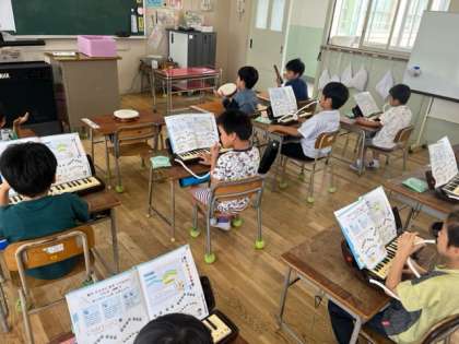 1.2年生は「カエルの歌」の合奏です。1年生がタンバリン、2年生は鍵盤ハーモニカです。
