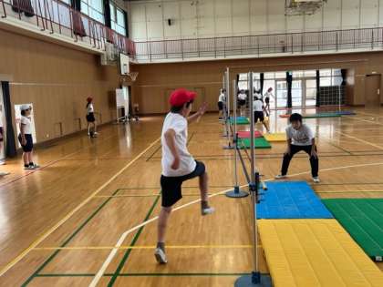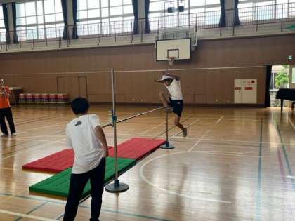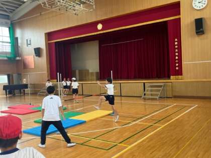 6年生では、体育の時間に「走り高跳び」を学習します。助走の歩数を合わせて、足を高く振り上げて高さに挑戦です。