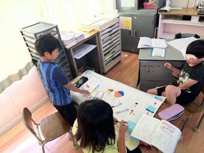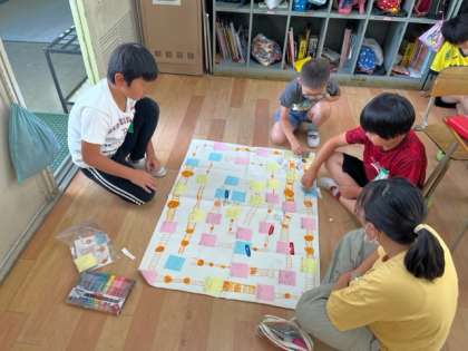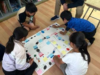 4年生が作っていた「すごろく」が完成したようです。試しに自分たちの作ったすごろくを楽しんでいました。