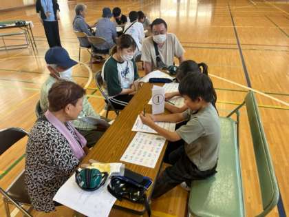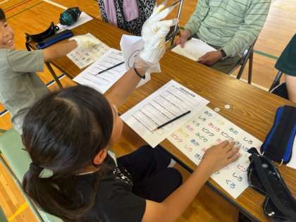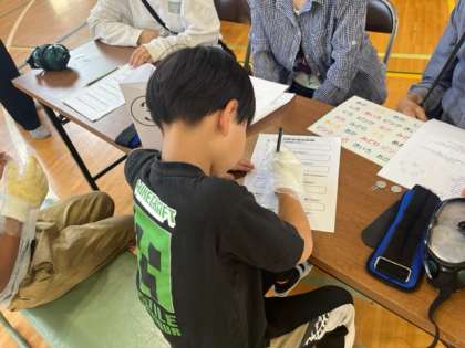 手袋をつけて名前を書いたり小さなものをつかむのはとても大変だと言うことが体験できます。