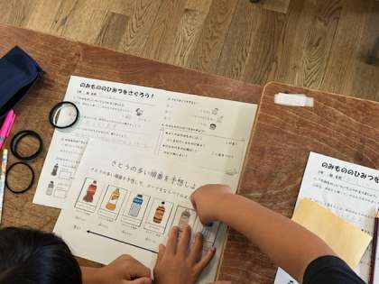 3年生は食育の学者でに「のみもの」について調べていました。1日に摂って良いお砂糖は20gですが、炭酸飲料にはどれくらいの入っているのかな?