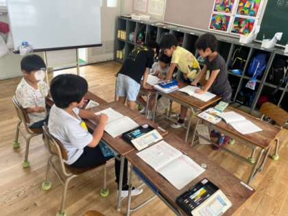 1.2年生の教室では、算数の学習が進んでいました。2年生も1年生も、めあてを確認して自分たちで学びをすすめています。