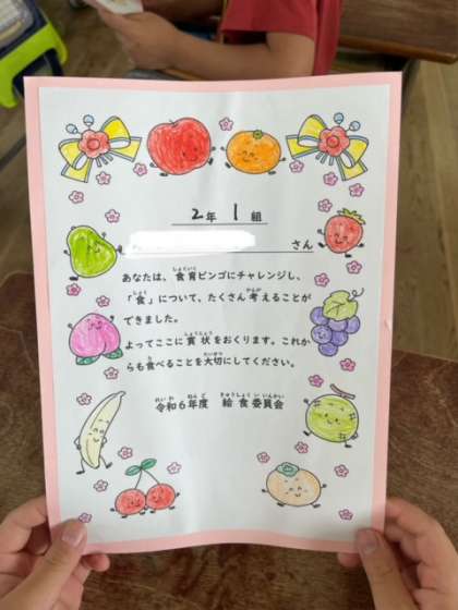 今朝は朝学習の前に先週取り組んでいた「食育ビンゴ」の表彰をしてもらいました。保健委員会の人が教室に来て賞状を渡してくれました。