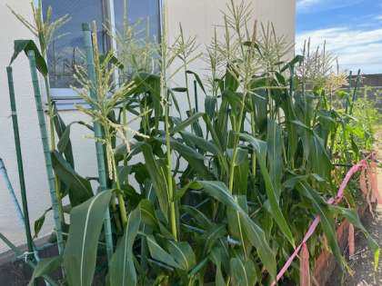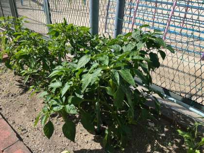 学校の学習園には、とうもろこし、ししとう、おくら、ミニトマト、夏野菜がたくさん実っています。給食委員会と栄養教諭、グリーンボランティアさんのおかけです。