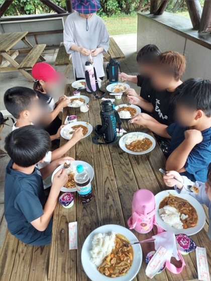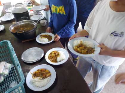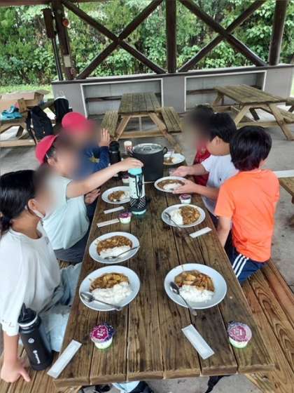 みんなで作ったカレーをみんなで食べます。まず一つ「みんなは一人のために、一人はみんなのために」が実践できました。美味しいね!