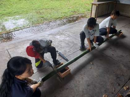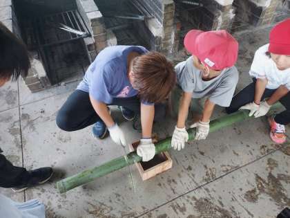 次は名人のお手本通りに器を作ります。節に沿ってノコギリで1つずつ切り離します。これも協力が大切ですね。