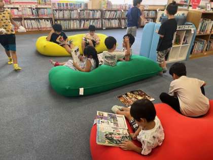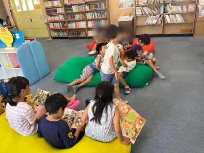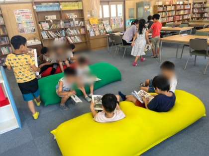 1.2年生が図書室で読書をしていました。1人1冊本を読みます。リラックスしていますね。
