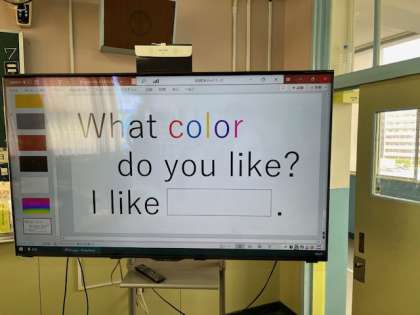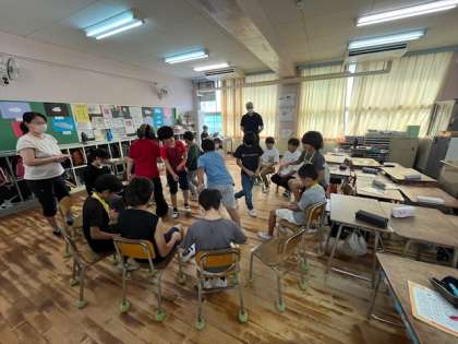 5年生の外国語の時間です。英語でフルーツバスケットをして楽しんでいました。