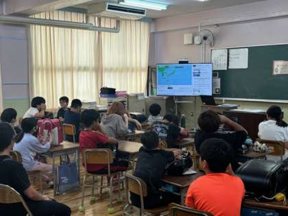 台風が近づいている想定で集団下校をします。台風の動画を見て、避難をします。