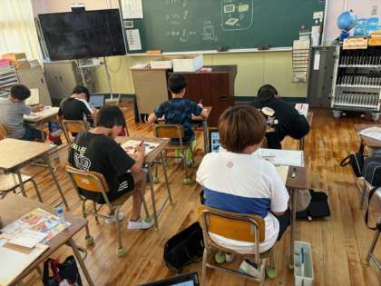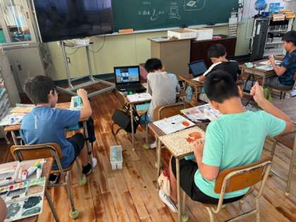 5年生は「パズル」を作っていました。下絵に絵の具で色をつける子や図工室で糸のこを使って切り取る子がいました。