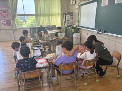 2年生は、国語の時間に「お話を作ろう」の学習をしていました。絵を見て抜けている場所のお話をつくります。自由な発想で意見をだしあっていました。