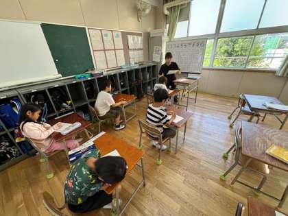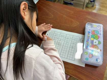 1年生がカタカナの小テストをしていました。「え、どんなんやった?」頑張って思い出してね。