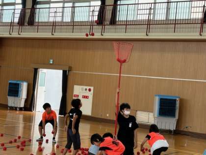 玉入れは赤も白も班の得点です。がんばれ〜