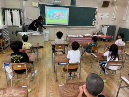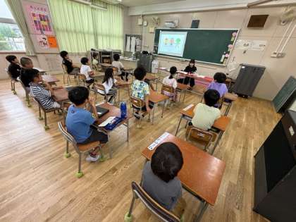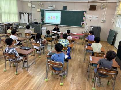 1.2年生がEnglish timeの時間に「HELLO SONG」を歌っていました。2年生は去年から知っているのでリードしています。