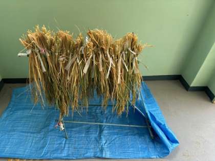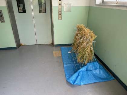 5年生が稲刈りをした稲を干しています。雨がかからなくていいですね。