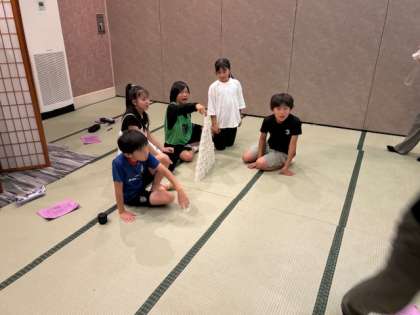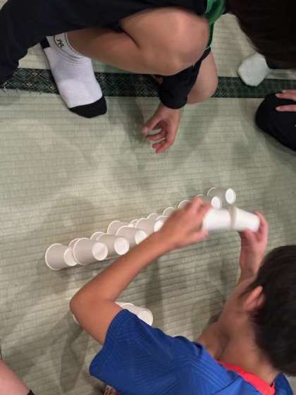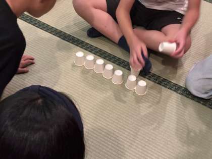 次のゲームは、紙コップタワーです。55個の紙コップをいち早くつめるのは?