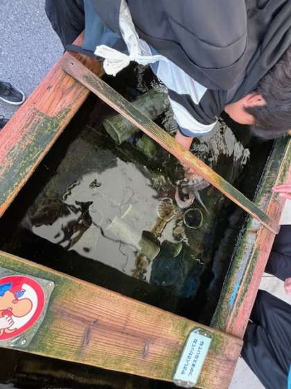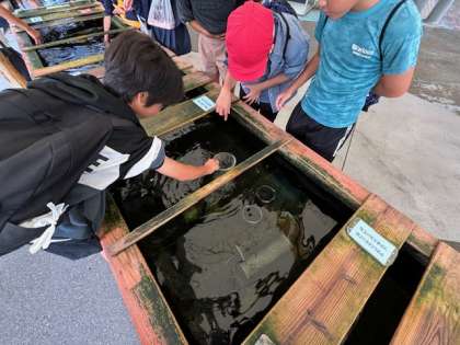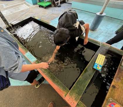 ふれあい水槽で、タコを捕まえると張り切っています。