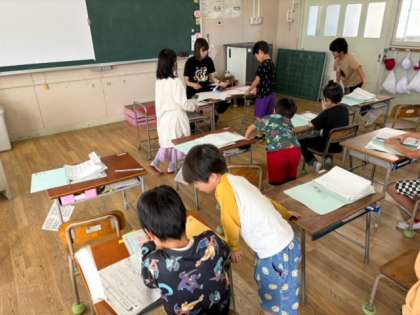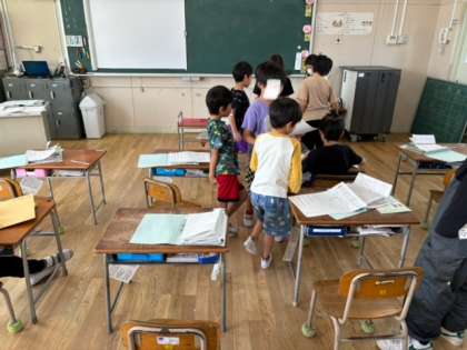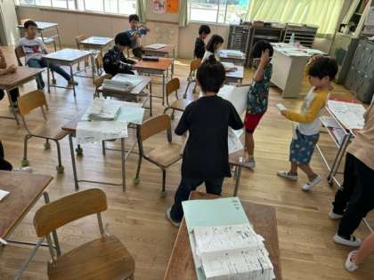 1年生の教室では何やらたくさんプリントを返却してもらっていました。「200まいはあるわ。」とのことです。ファイルにとじるのもひとくろうですね。