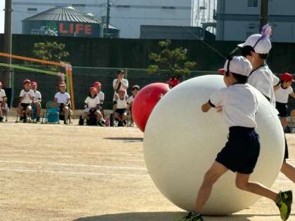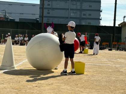 プログラム3「変身玉転がし!コーロコロ」1.2年生は、大玉を転がして、変身までします。