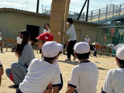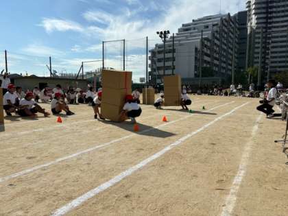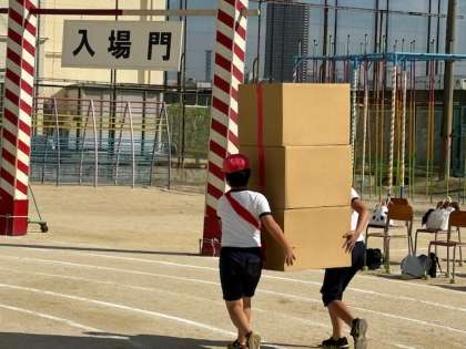 プログラム3「あなたは慎重派?大胆派?」5.6年生の段ボール運び。保護者の皆さんも真剣に運びます。