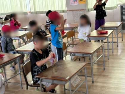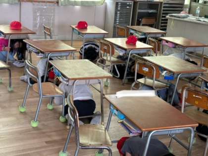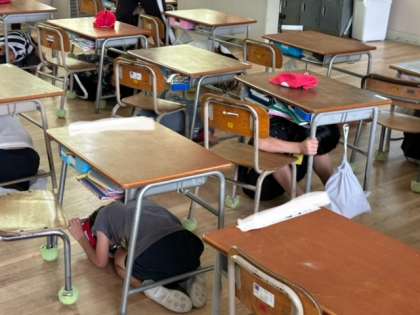 南海トラフ地震を想定して避難をします。揺れがひどい時は机の下に入って頭と体を守ります。