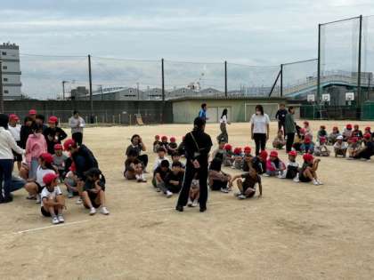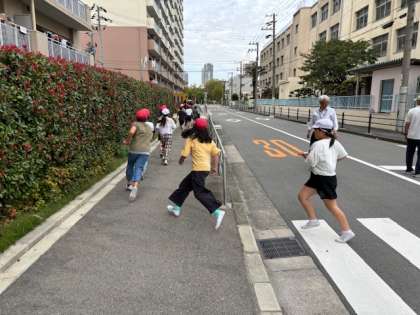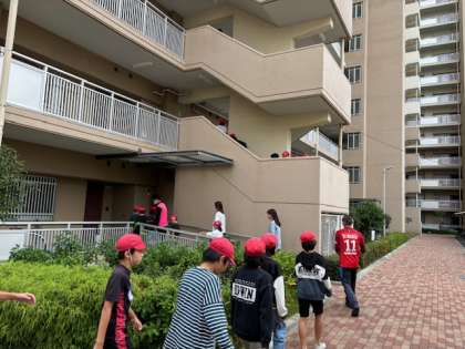 運動場に一度集まり人数を確認してすぐに池島住宅1号棟の10.11階に上がります。なるべく早く静かに行動するのが大切です。