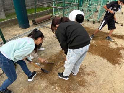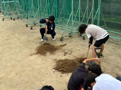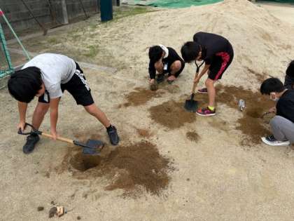 6年生が理科の時間に運動場に穴をほっていました。土の下に何があるのかを調べています。中学生も一緒にほってくれました。