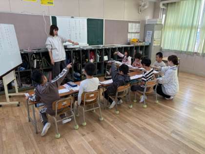 1.2年生が新出漢字の学習をしていました。空中黒板に書き順を書いて、ドリルに書いて進めます。