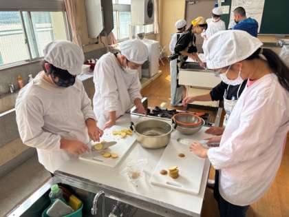 6年生が家庭科の時間に「ジャーマンポテト」をつくっていました。ジャガイモを切って、茹でていました。
