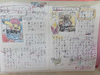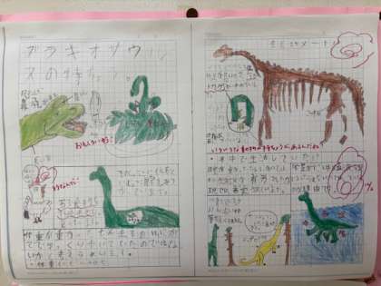 4年生のお手本ノートです。自由なテーマで研究した成果をノートにまとめています。いろんな研究をしていますね。