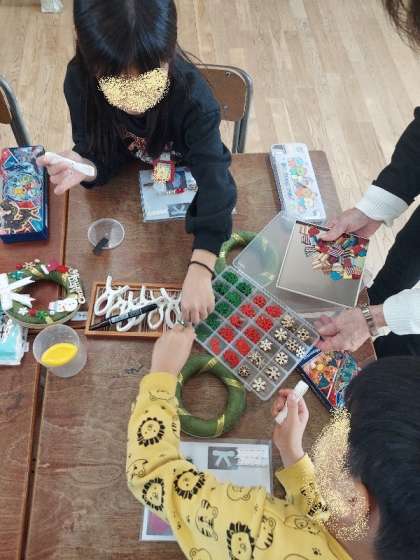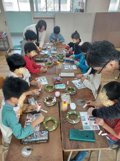 地域の生涯学習の方々に来ていただいて、クリスマスリースづくりをしました。