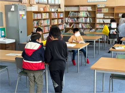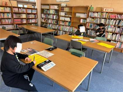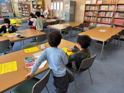 1.2年生が図書室で本を読んだり借りたりしていました。好きな本の傾向が決まっているようです。