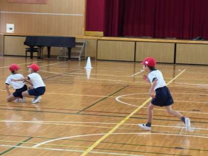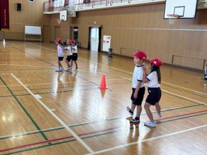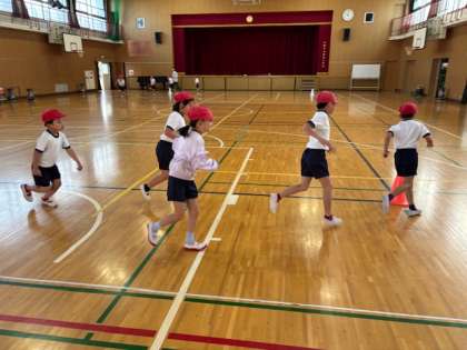 1.2年生が体育の時間にリズムダンスをして、かけあしをしていました。ダンスはかわいく、かけあしは元気にできていました。