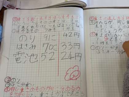 3年生が算数の時間に重さg(グラム)の学習をしていました。1gは1円玉1個分を使うとどうなるのかな?