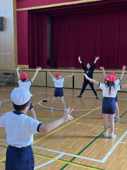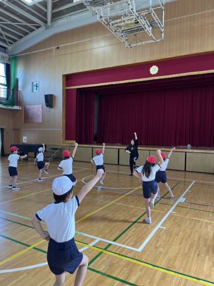 今日は、大阪エヴェッサのリアリーダーの皆さんが来てくださいました。1.2年生がチアリーディングにチャレンジです。