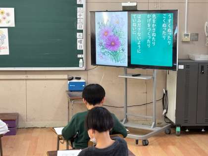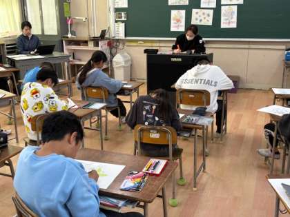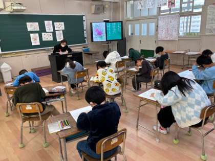 4年生が図工の時間に色鉛筆で色の塗り方を工夫して描いていました。色鉛筆絵画は濃淡の表現や色の乗せ方がとても繊細です。全員シーンと集中しています。