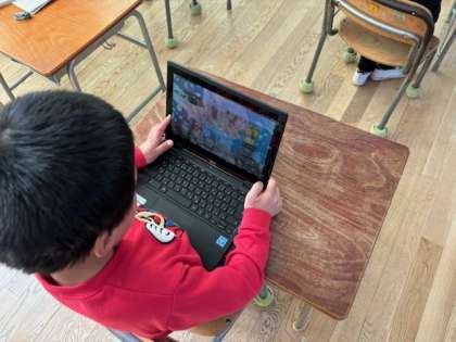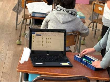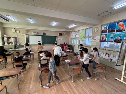 1年生が学習者用端末を使って学習していました。デジタルドリルやプログラミングなど自分で考えて取り組みます。終わればさっと片付けるところも素晴らしい。