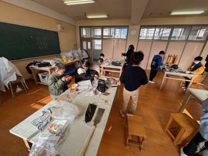 4年生が図工室で木工作品を作っていました。切り離した木を組み合わせて作品にしていました。サメに見えるのでそうしたよと教えてくれました。