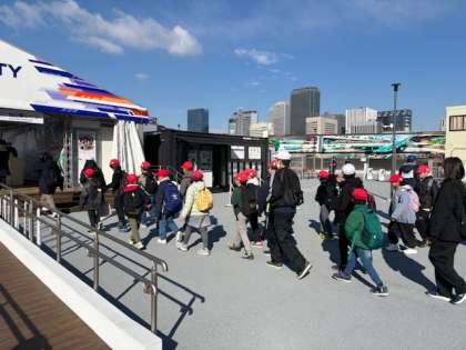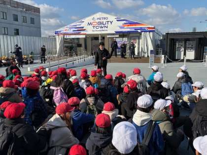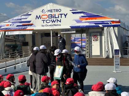 今日は全校みんなで森ノ宮にできた「e mobilitytown」に出かけます。縦割り班ごとに仲よく見学します。