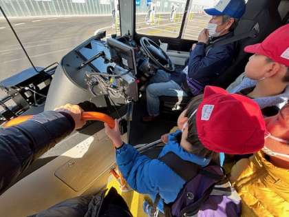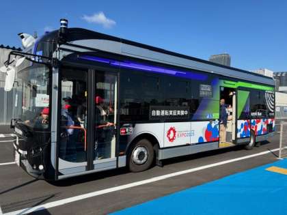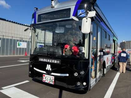 自動運転のバスが走っていて、体験乗車ができます。ブレーキ、アクセル、ハンドル全て自動で動く未来の乗り物です。3.4年後には実際に大阪市内を走るそうです。