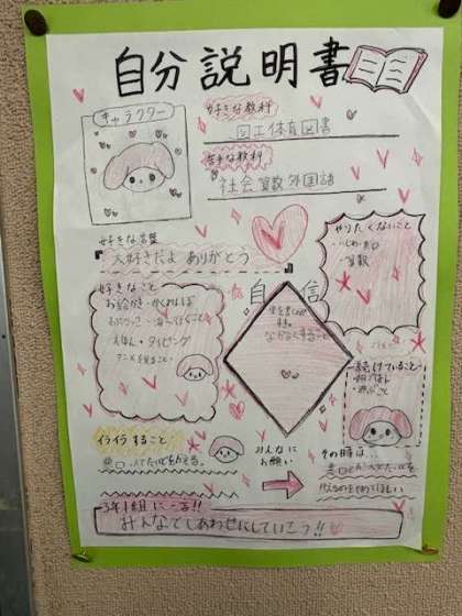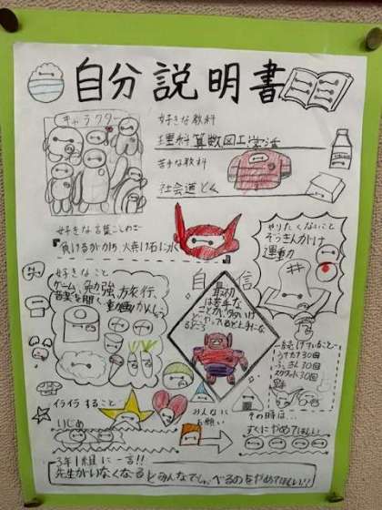 3年生の教室で「自分説明書」が掲示されていました。とてもかわいいできです。