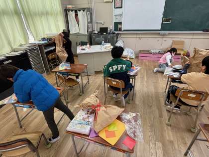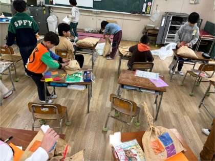 1.2年生の図工で造形遊びをしていました。袋にシュレッダーの紙屑を詰めて、見えたものにしていきます。亀にサメ、ハムスターになるみたいです。