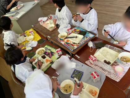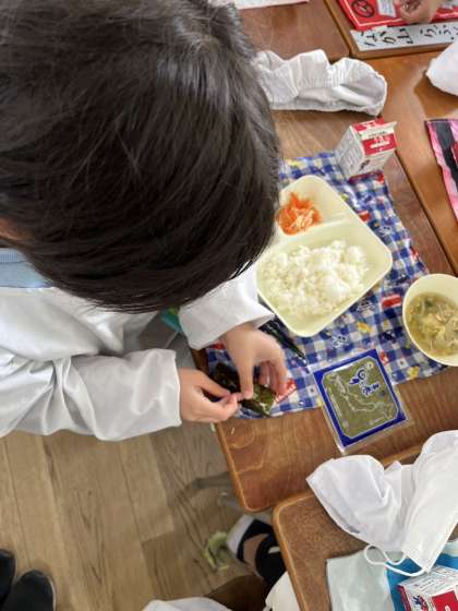 今日の給食のおかずは、手巻きキンパです。のりにご飯を乗せて、具を巻いて食べます。1.2年生も上手にまけますね。