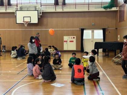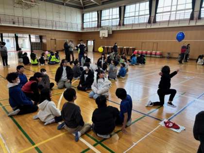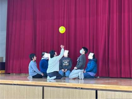 今朝の全校集会は「風船バレー」です。座ったままで何回続けられるかな?