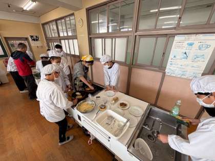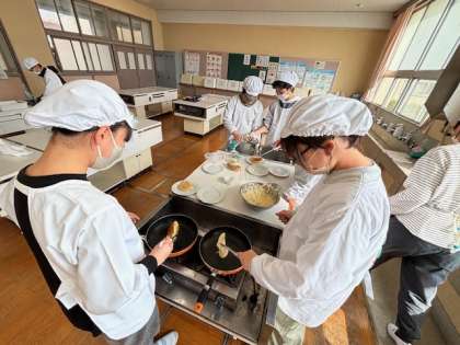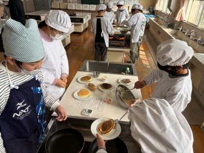 6年生は小学校最後の調理実習です。みんなで協力してホットケーキを焼いていました。