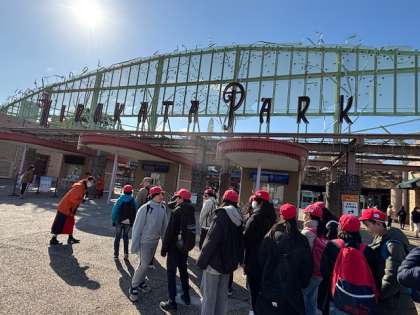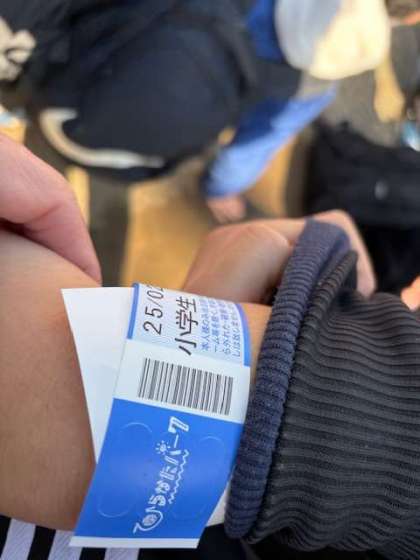 今日は卒業遠足です。ひらかたパークまで来ました。先生のお話を聞いて、パスを腕に巻いて出発します。