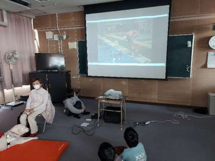 最初に講師の方のお話を聞きました。バタフライで泳いでいる動画も見せてくれました。