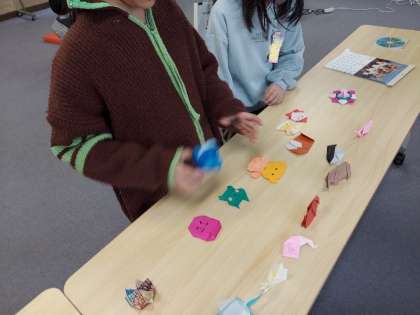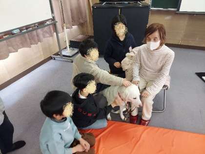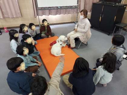 盲導犬に触れたり、持ってきてくれた折り紙や絵本、カレンダーなどを触ったりしました。