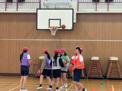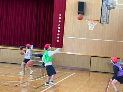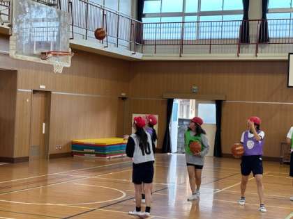 6年生は体育の時間にバスケットボールをしていました。レイアップシュートやミドルシュートの練習です。