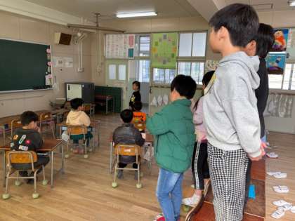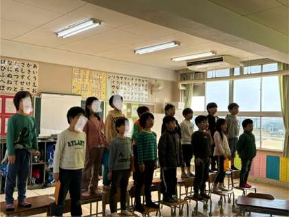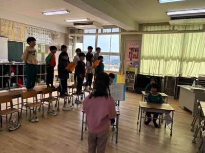 来年度の新入生の入学式でお祝いの演技をします。大きな声で頑張って練習しています。